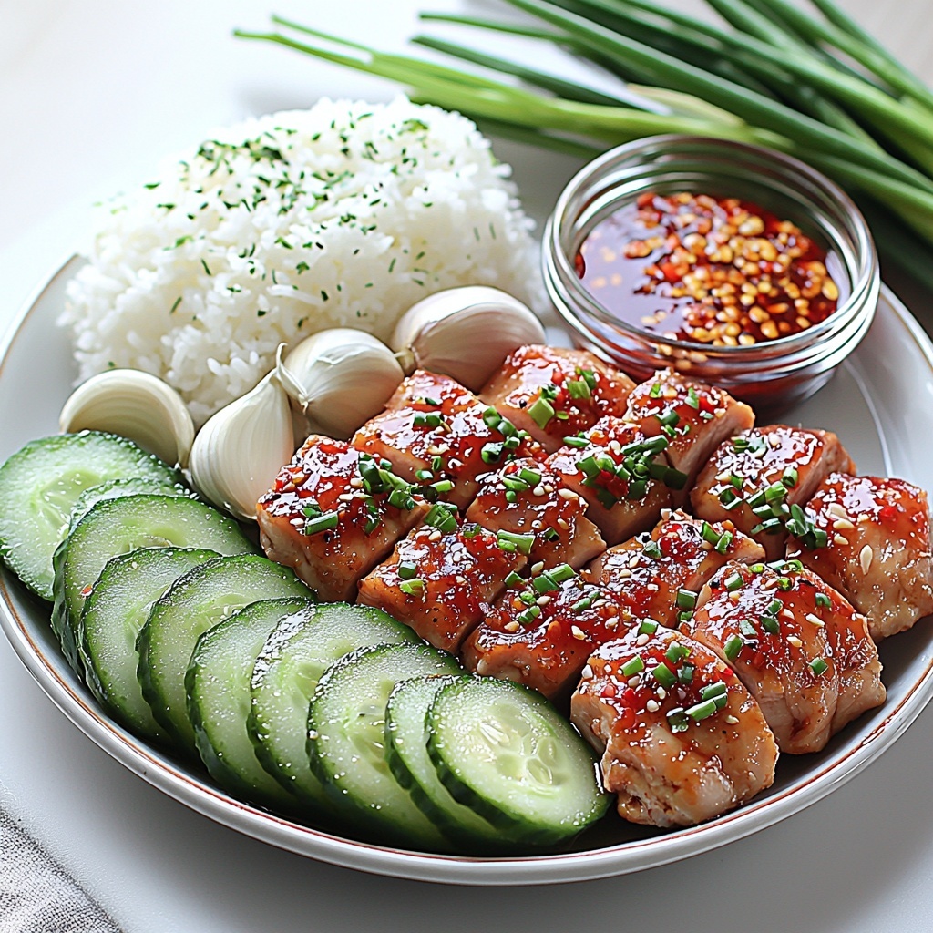 - Assemble and serve: Place cooked rice in serving bowls, arrange the caramelised chicken on top, and ladle some garlic ginger broth over it. Garnish with fresh cucumber slices, the prepared spring onion mixture, and a spoonful of sambal if desired for heat.