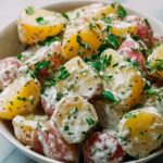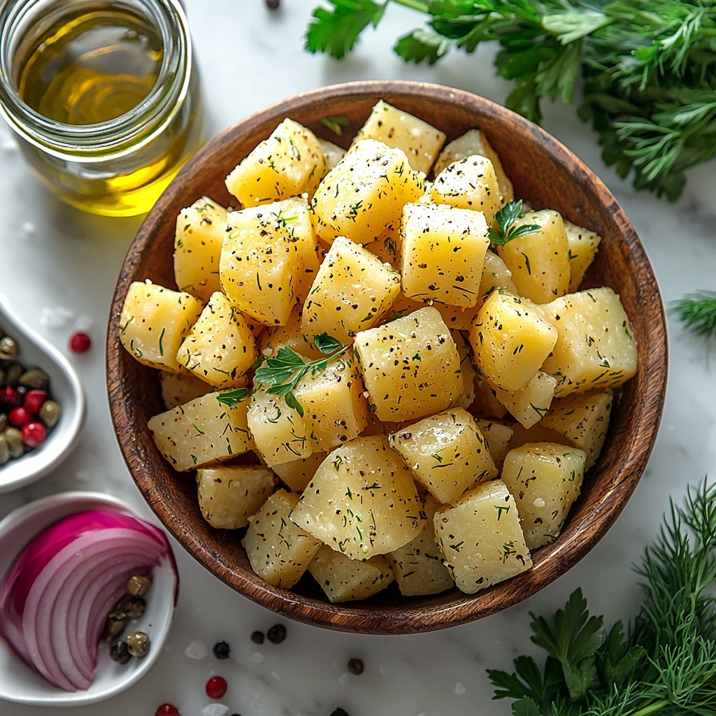 - Prepare Potato Mixture: Once drained, mash the potatoes in a large bowl until smooth. Add chopped red onion, parsley, dill, capers, and 1/4 cup Dijon mustard. Mix well to combine all ingredients evenly.