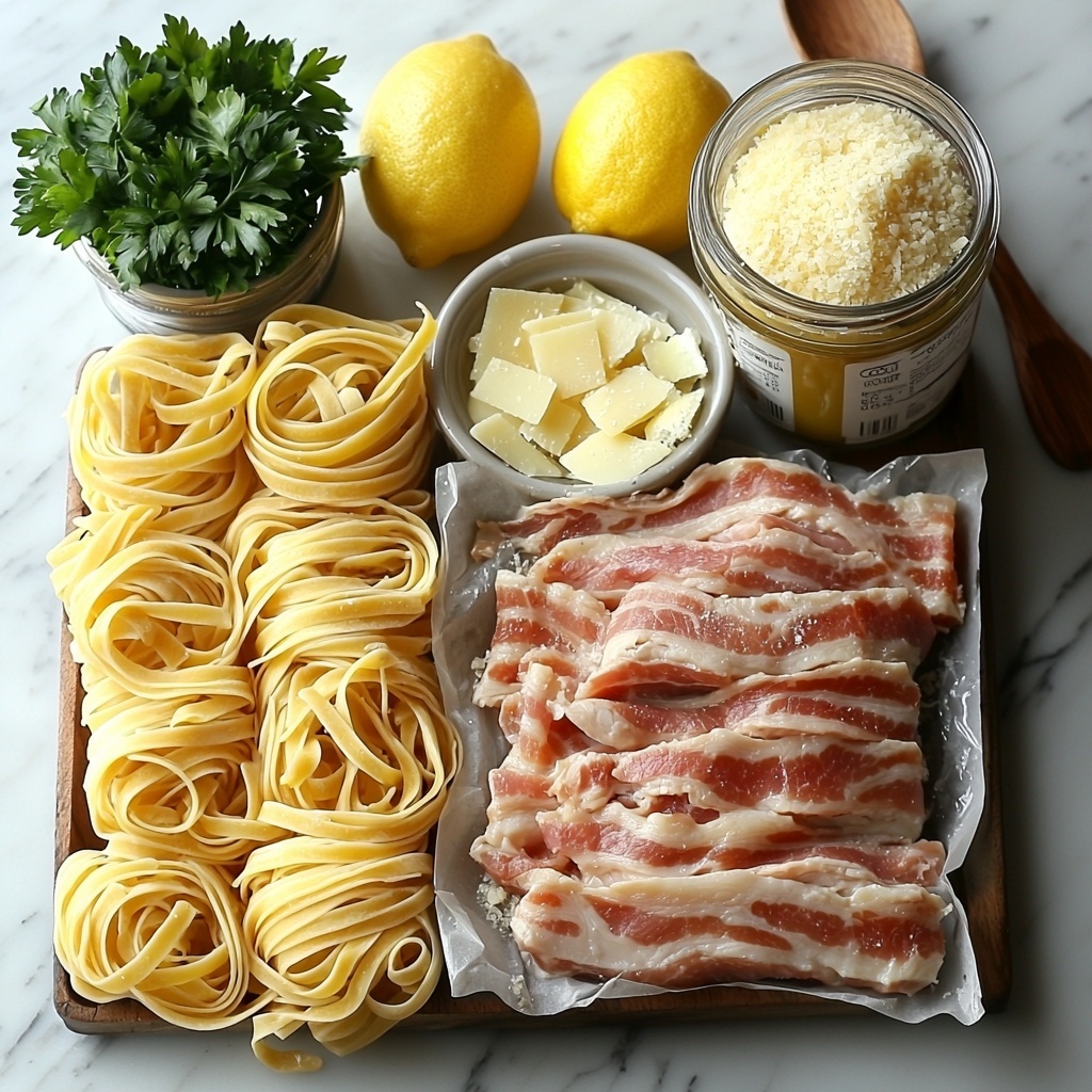Every ingredient in this recipe is simple yet essential, working harmoniously to create a dish packed with flavor, texture, and a lovely mix of colors. Each item plays a special role—from the smoky bacon that adds crunch, to the creamy Parmesan that enriches the sauce, making this a truly satisfying dish.