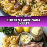 This Creamy Chicken Carbonara Skillet is an easy and delicious one-pan meal featuring tender sautéed chicken, crispy bacon, and a rich, creamy sauce made from eggs, Parmesan, and heavy cream, all tossed with fettuccine or spaghetti. Infused with lemon zest for brightness and finished with fresh parsley, it’s a comforting and flavorful pasta dish perfect for a quick weeknight dinner.