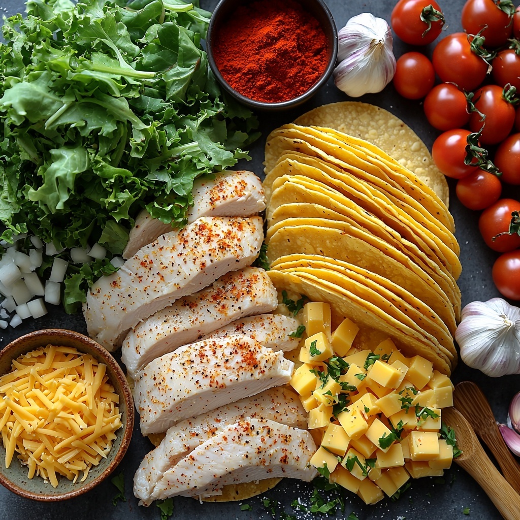 - Assemble Tacos: Fill each warmed tortilla with a generous amount of shredded chicken, then top with shredded cheese, lettuce, and diced tomatoes for a fresh, crunchy finish.