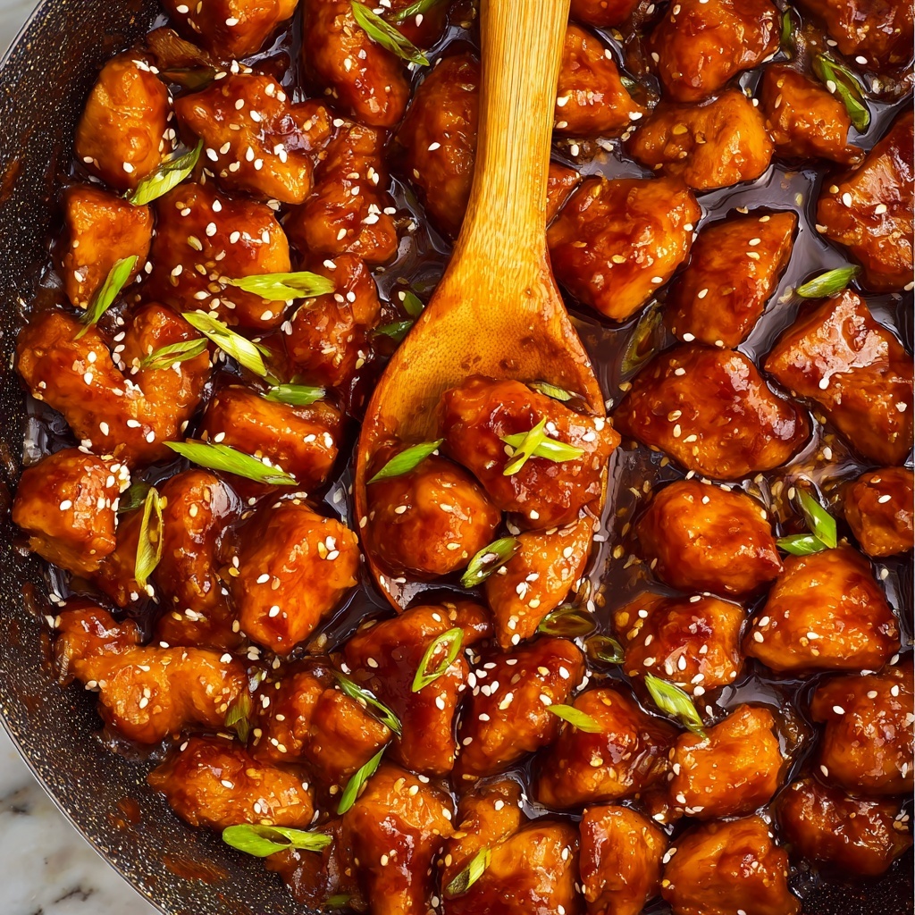 The sauce should be thick and glossy enough to coat each piece of chicken rather than run watery. Adjust the amount of cornstarch to your liking when mixing the sauce—more for a thicker glaze, less for a lighter coating.