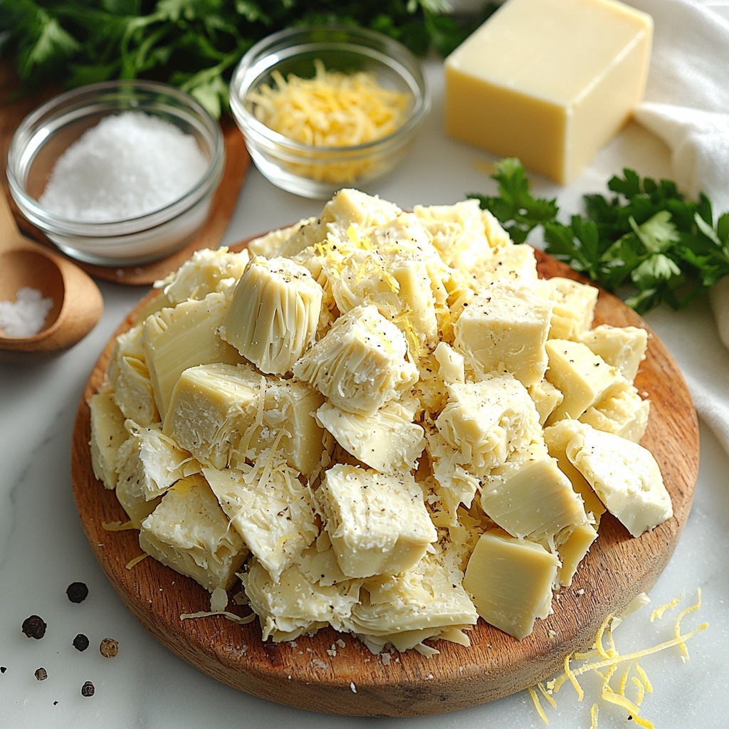 - Prepare the Artichoke Mixture: Place the drained artichoke hearts in the bowl of a food processor. Add the grated Parmesan cheese, fresh lemon juice, minced garlic, and fresh parsley. Pulse the ingredients until you achieve a mostly smooth paste, ensuring some bits of parsley remain visible for texture and color.