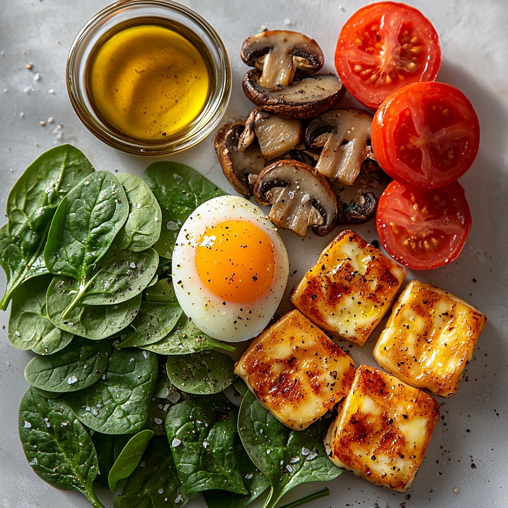 - Assemble Plate: On a plate, arrange the fried eggs as the base. Add the wilted spinach and sautéed mushrooms alongside. Include the charred tomato halves and grilled halloumi slices to complete the protein-packed veggie breakfast plate.