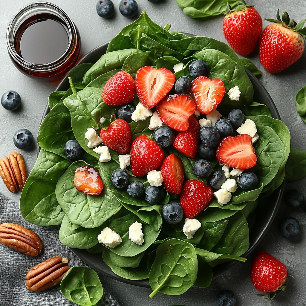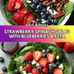 A fresh and vibrant Strawberry Spinach Salad featuring sweet strawberries, juicy blueberries, tangy feta cheese, and crunchy pecans, all tossed in a homemade balsamic honey dressing. This salad is perfect for a light, nutritious meal or side dish, offering a wonderful balance of flavors and textures.