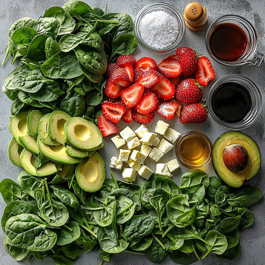 Getting this salad just right is all about the thoughtful simplicity of ingredients. Each one plays a crucial role, contributing unique tastes, textures, and colors that make the Strawberry Spinach Salad with Feta, Pecans, and Balsamic Vinaigrette Recipe so memorable.