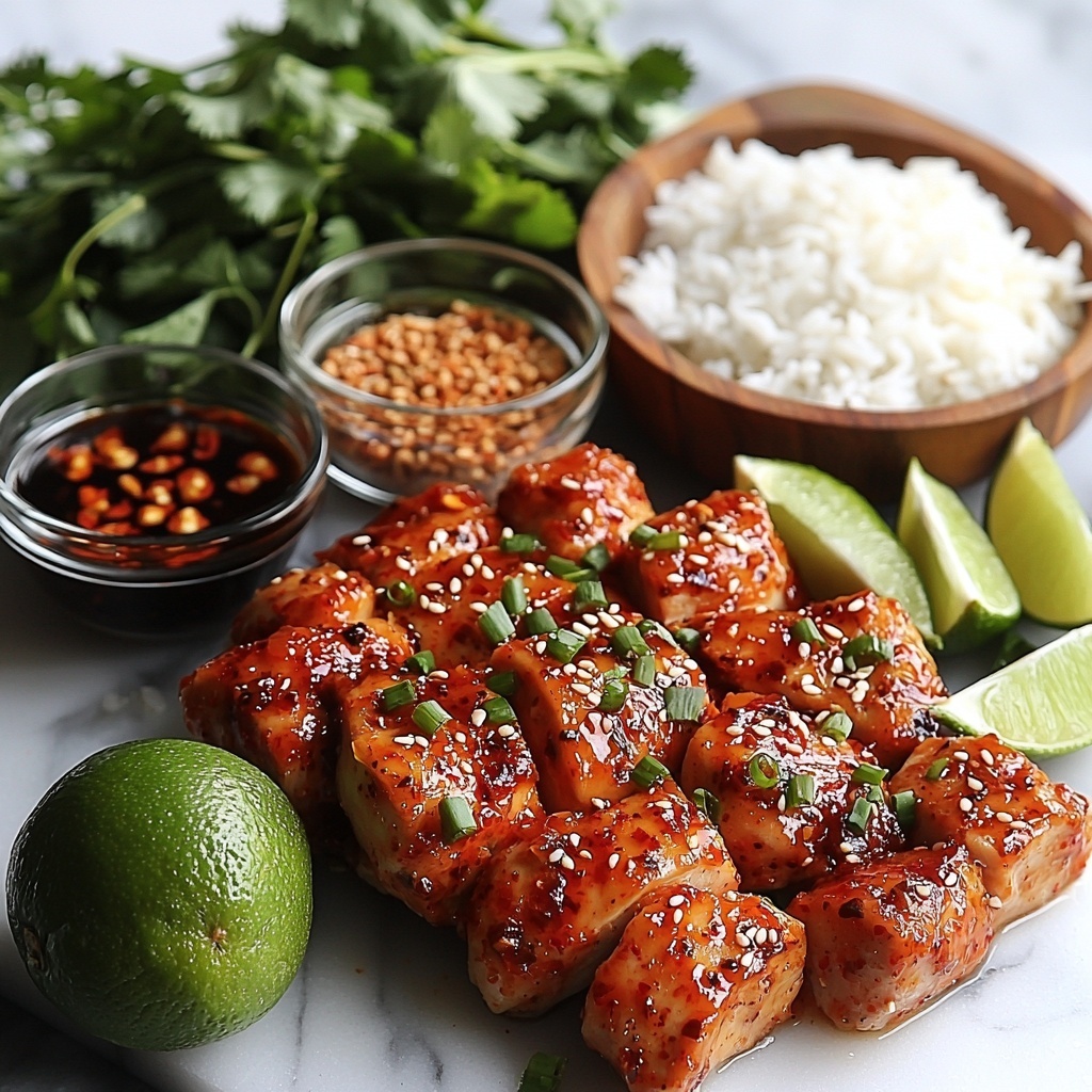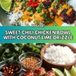 A vibrant and flavorful Sweet Chili Chicken Bowl featuring tender marinated chicken thighs seared to perfection, served over jasmine rice and drizzled with a creamy coconut lime sauce. This quick 30-minute recipe combines sweet, tangy, and savory elements for a satisfying meal, garnished with fresh cilantro and lime wedges for a burst of freshness.